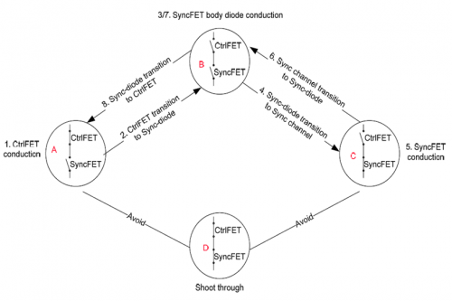 同步降壓穩壓器主要有3種工作狀態,其開關順序是A-B-C-B-A,如圖2所示。