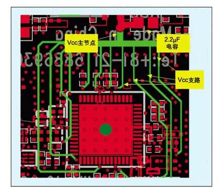 在Vcc星型拓撲的主節點處最好放置一個大容量的電容器,如2.2μF。該電容具有較低的SRF,對于消除低頻噪聲、建立穩定的直流電壓很有效。IC的每個電源引腳需要一個低容量的電容器(如10nF),用來濾除可能耦合到電源線上的高頻噪聲。對于那些為噪聲敏感電路供電的電源引腳,可能需要外接兩個旁路電容。例如:用一個10pF電容與一個10nF電容并聯提供旁路,可以提供更寬頻率范圍的去耦,盡量消除噪聲對電源電壓的影響。每個電源引腳都需要認真檢驗,以確定需要多大的去耦電容以及實際電路在哪些頻點容易受到噪聲的干擾。
