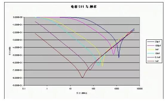 給出了不同容值下的典型S11參數,從這些曲線可以清楚地看到SRF,還可以看出電容越大,在較低頻率處所提供的去耦性能越好(所呈現的阻抗越低)。